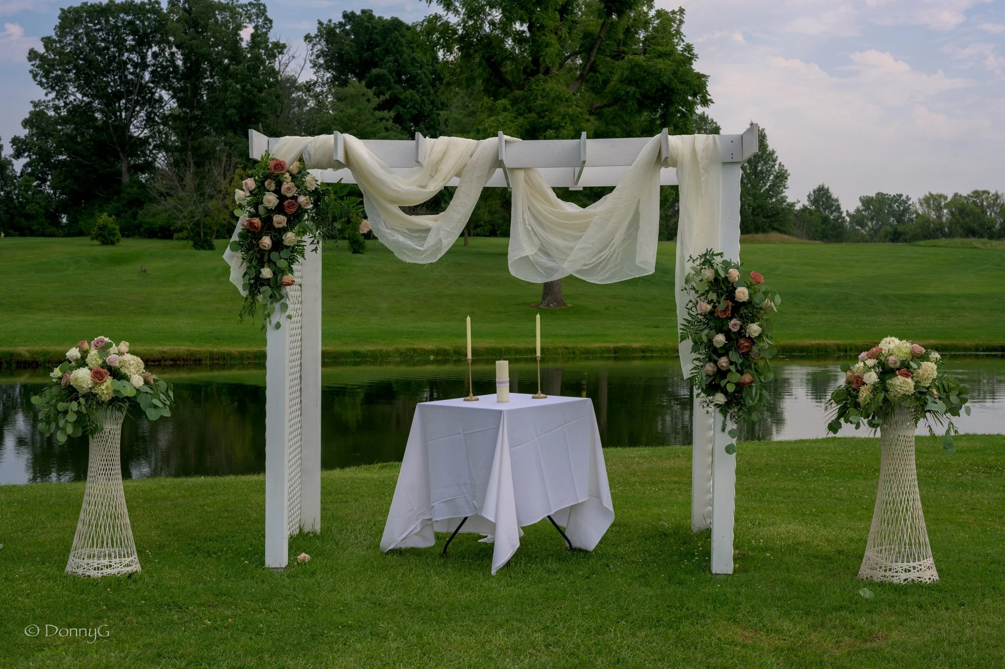 Outdoor wedding altar setup by a pond, featuring a white wooden arch draped with sheer fabric and adorned with floral arrangements, a small table with a white cloth and three candles, set on a green lawn with trees in the background.